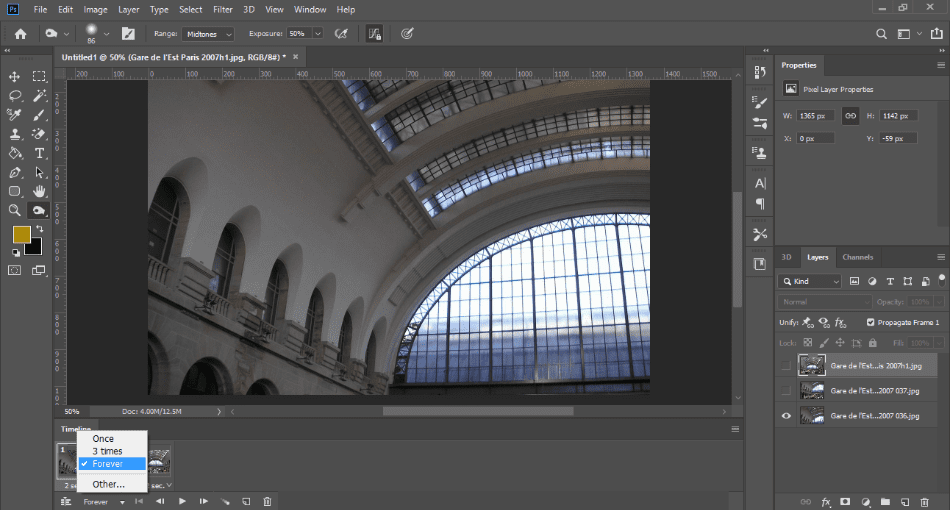 By using the timeline window in photoshop, you can create animated looping gifs out of any image... 03.02.2016 · in this tutorial, you'll learn how to turn a series of photos into a looping animated gif using photoshop. Gif animation goes at your speed by making frame rate adjustments using the timeline panel.